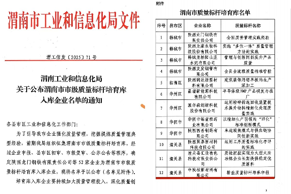[2025-08-05]中陜核新材料有限公司成功入選渭南市市級(jí)質(zhì)量標(biāo)桿培育庫近日,渭南市工業(yè)和信息化局公布了2025年度市級(jí)質(zhì)量標(biāo)桿培育庫入庫企業(yè)名單,中陜核新材料有限公司憑借在質(zhì)量管理領(lǐng)域的卓越實(shí)踐與突出成果成功入選,成為市級(jí)質(zhì)量標(biāo)桿培育...