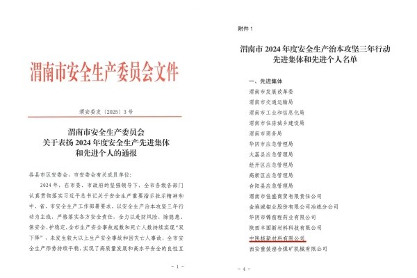 近日,渭南市安委辦通報表揚了2024年度治本攻堅三年行動成績顯著單位,中陜核新材料有限公司獲評渭南市安全生產(chǎn)治本攻堅三年行動“先進集體”榮譽。