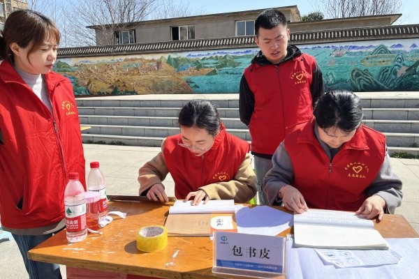 包書皮服務(wù)區(qū)和輪胎打氣服務(wù)區(qū),志愿者們也早早準備好了各種大小的書皮、剪刀、鋼尺等工具,經(jīng)過耐心細致的服務(wù),不一會兒,學(xué)童們的教育書籍和老人們心愛的小說文選便穿上了干凈的“外衣”,一輛輛自行車、電動車的車胎也打滿了氣駛離現(xiàn)場、繼續(xù)前行。