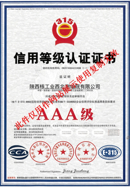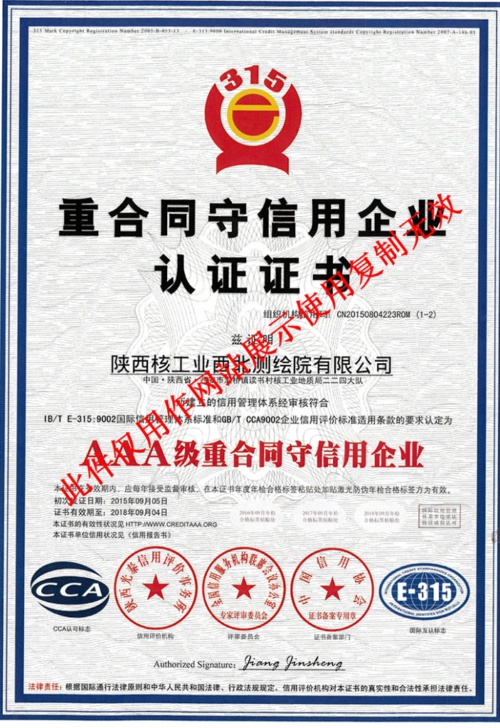秋風送爽,喜訊頻傳,陜西核工業(yè)西北測繪院各方面工作齊頭并進,繼中標鎮(zhèn)巴項目、資質升甲后,測繪院又一舉榮獲3A級質量服務誠信單位認證證書,3A級重合同守信用企業(yè)認證證書,3A級信用等級認證證書以及職業(yè)健康安全管理體系認證證書共四項認證證書。