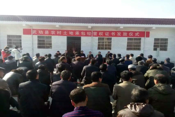 12月26日,武功縣農(nóng)村土地承包經(jīng)營權(quán)確權(quán)登記頒證首發(fā)儀式在蘇坊鎮(zhèn)瓦子腰村舉行??h確權(quán)登記頒證工作相關(guān)單位項目負責人、陜核西北測繪院武功項目負責人殷文華以及瓦子腰村村民群眾等共計100多人參加了儀式。咸陽市政府、武功縣委、縣政府領(lǐng)導及相關(guān)單位負責人出席了儀式。