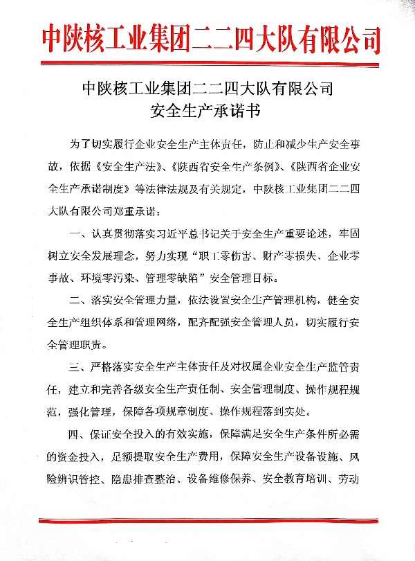 中陜核工業(yè)集團(tuán)二二四大隊(duì)有限公司安全生產(chǎn)承諾書